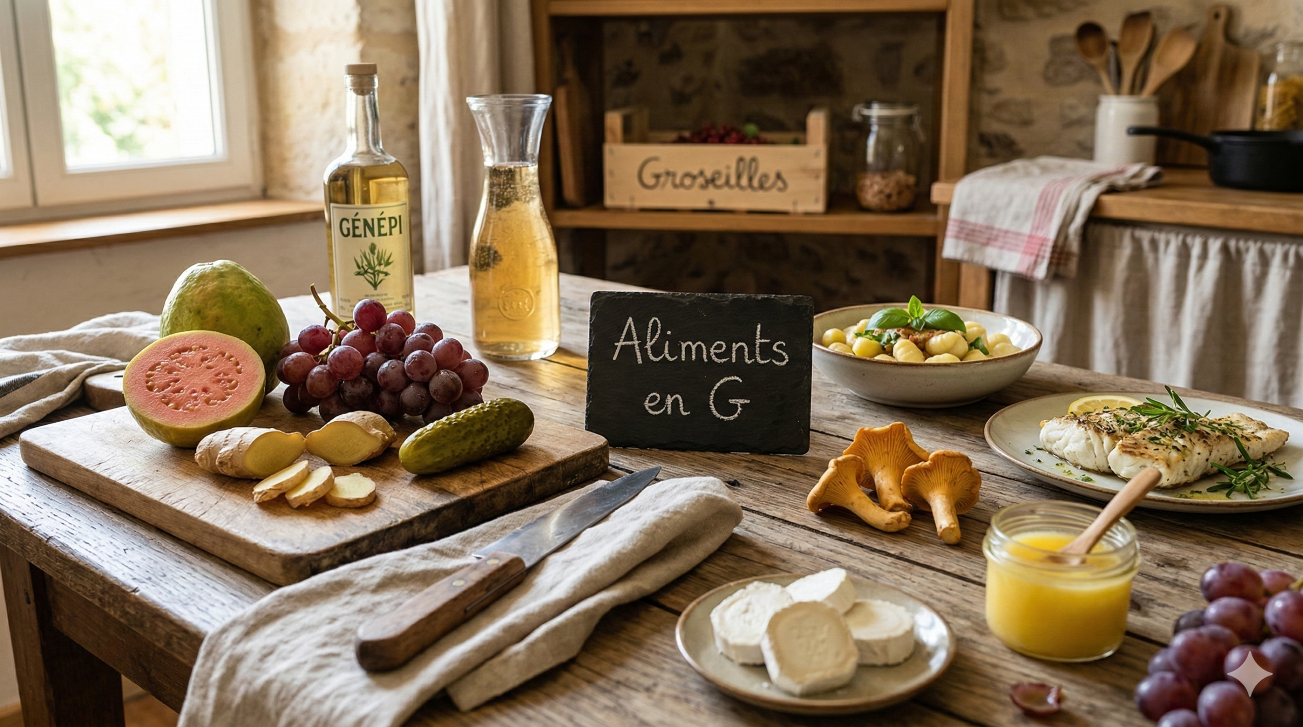 Voici une vue d’ensemble rapide des aliments en G avant d’entrer dans le détail. Plus de 60 noms sont répartis dans les sections suivantes. On y trouve des classiques comme le gruyère ou les gambas, mais aussi des moins évidents comme la garbure ou le granité.