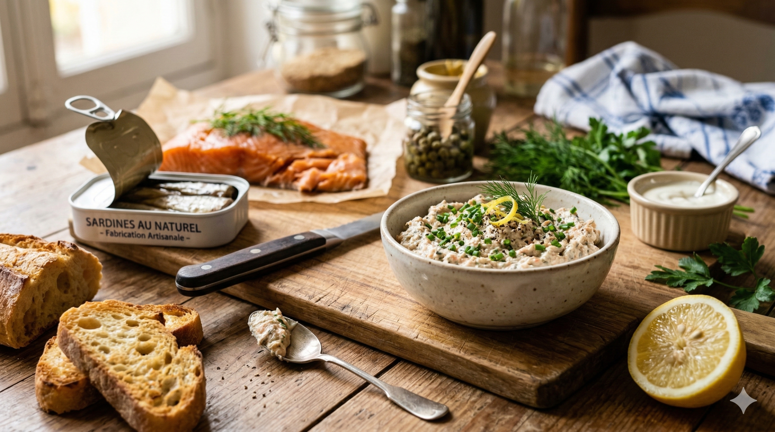 Côté budget, une boîte de sardines coûte environ 0,80 € à 1,50 €. Une boîte de thon tourne autour de 1,20 € à 2,50 €. Avec 150 g de fromage frais à 1,00 €, vous réalisez des rillettes pour 4 personnes pour moins de 3 € au total. Une barquette artisanale équivalente dépasse facilement 5 € à 7 € en épicerie fine.
